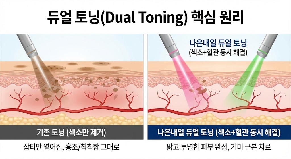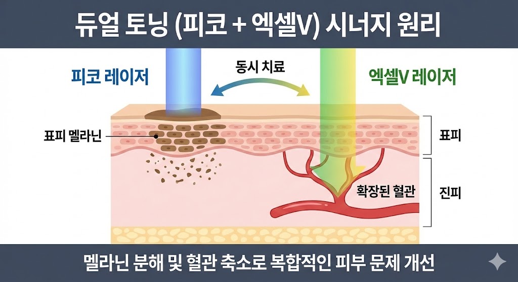 📌 용어 설명: 듀얼 토닝 (Dual Toning)이란? 서로 다른 파장과 원리를 가진 두 가지 이상의 레이저를 조합하여, 표피층의 색소(멜라닌) 문제와 진피층의 혈관(헤모글로빈) 및 환경 문제를 동시에 해결하는 복합 치료 솔루션을 의미합니다.