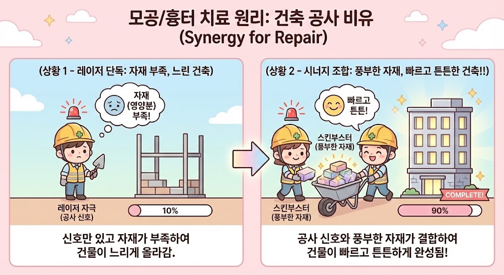 의사로서 솔직하게 말씀드리면, 최신 레이저 기술만으로는 부족할 수 있습니다. 성공적인 모공/흉터 치료의 핵심은 ‘자극’과 ‘재생 재료’의 완벽한 시너지에 달려있기 때문입니다.