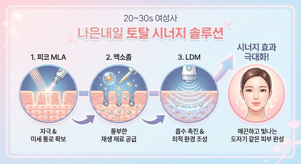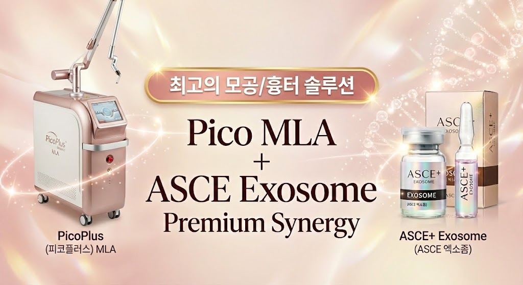 오늘은 모공/흉터 치료 효과를 2배 이상 극대화하는 비결인 피코프락셀(MLA)과 스킨부스터(엑소좀)의 시너지 조합 원리를 명확하게 설명해 드리겠습니다.