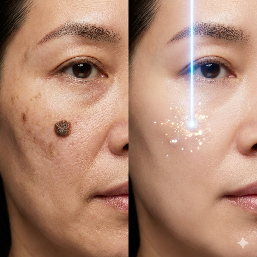 📌 용어 설명: 스팟 치료 (Spot Treatment)란? 전체적인 토닝 방식과 달리, 문제가 있는 특정 병변(점, 검버섯, 흑자 등) 부위에만 레이저를 집중적으로 조사하여 해당 조직을 제거하거나 색소를 파괴하는 치료 방식을 의미합니다.